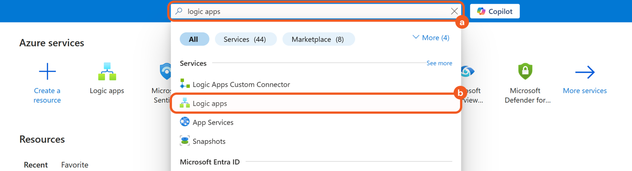 Search for Logic apps using the search bar, then click the matching result.