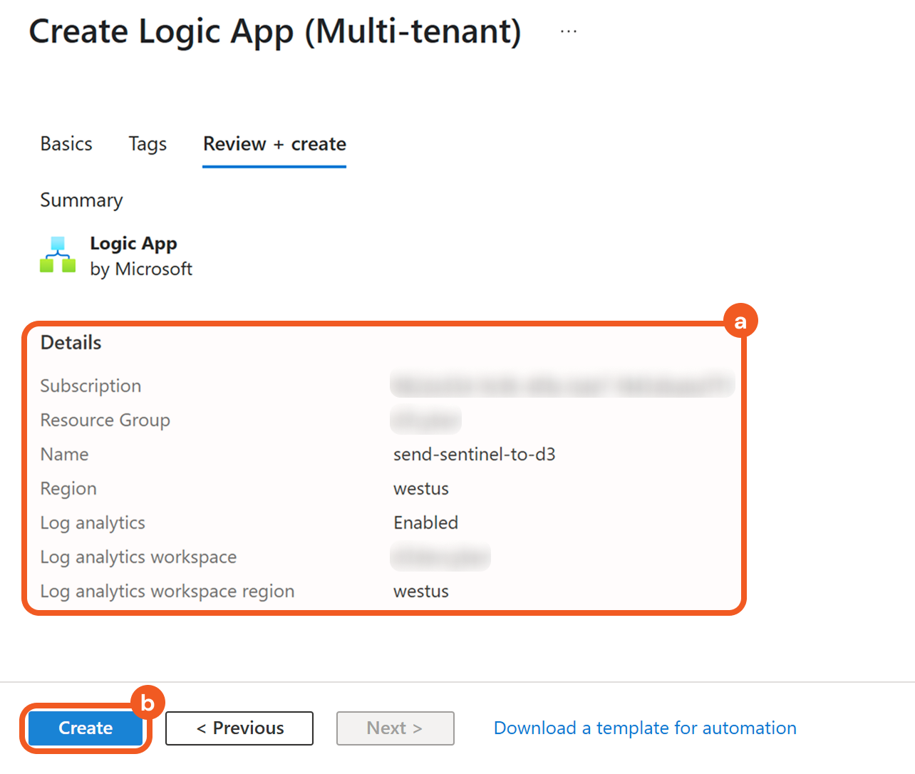 Click the Review + create button to validate the app.