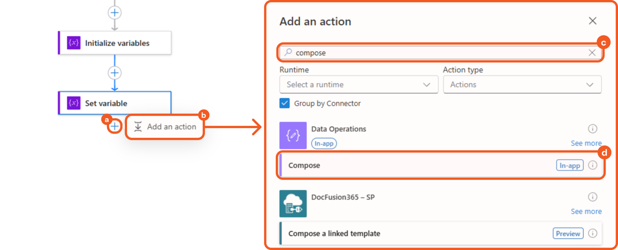 Add a Compose action below the Set variable action.