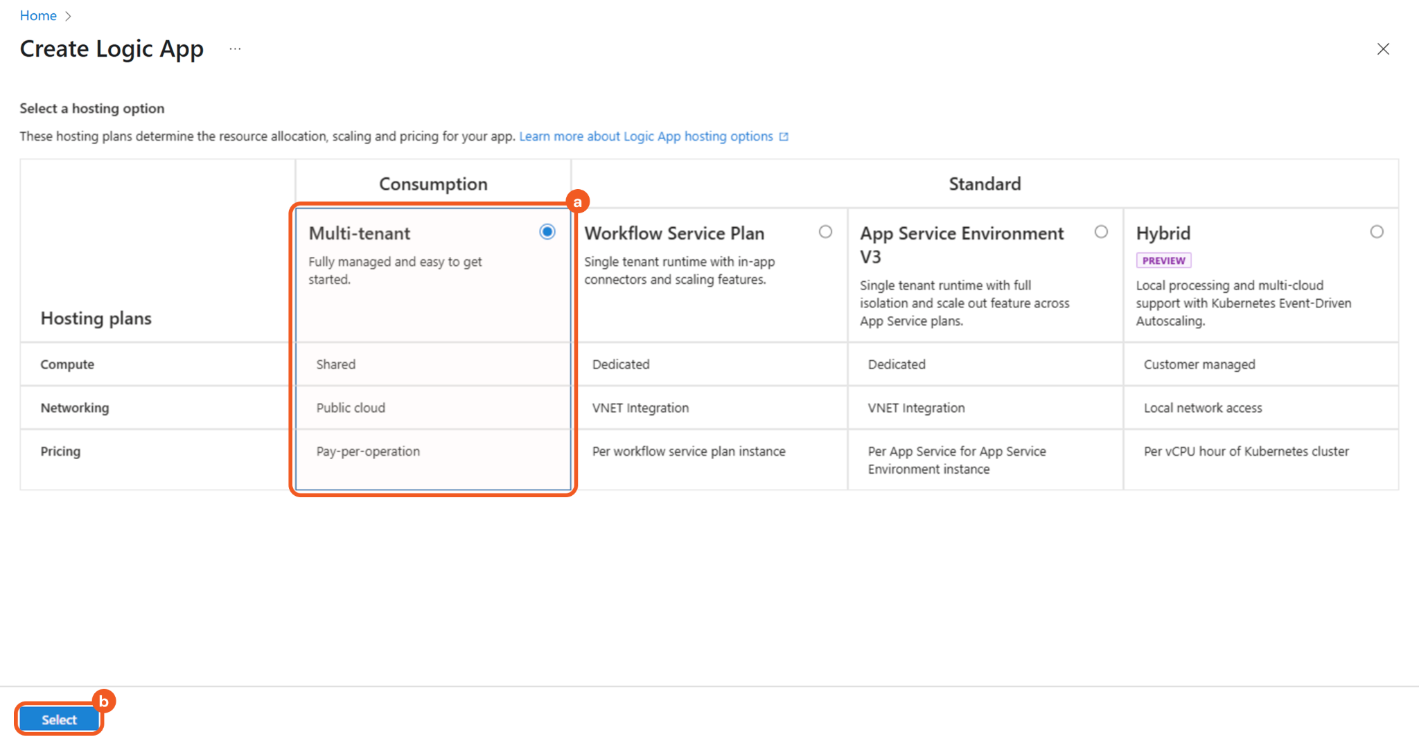 Choose the Multi-tenant option under the Consumption column, then click the Select button to proceed to the next step.