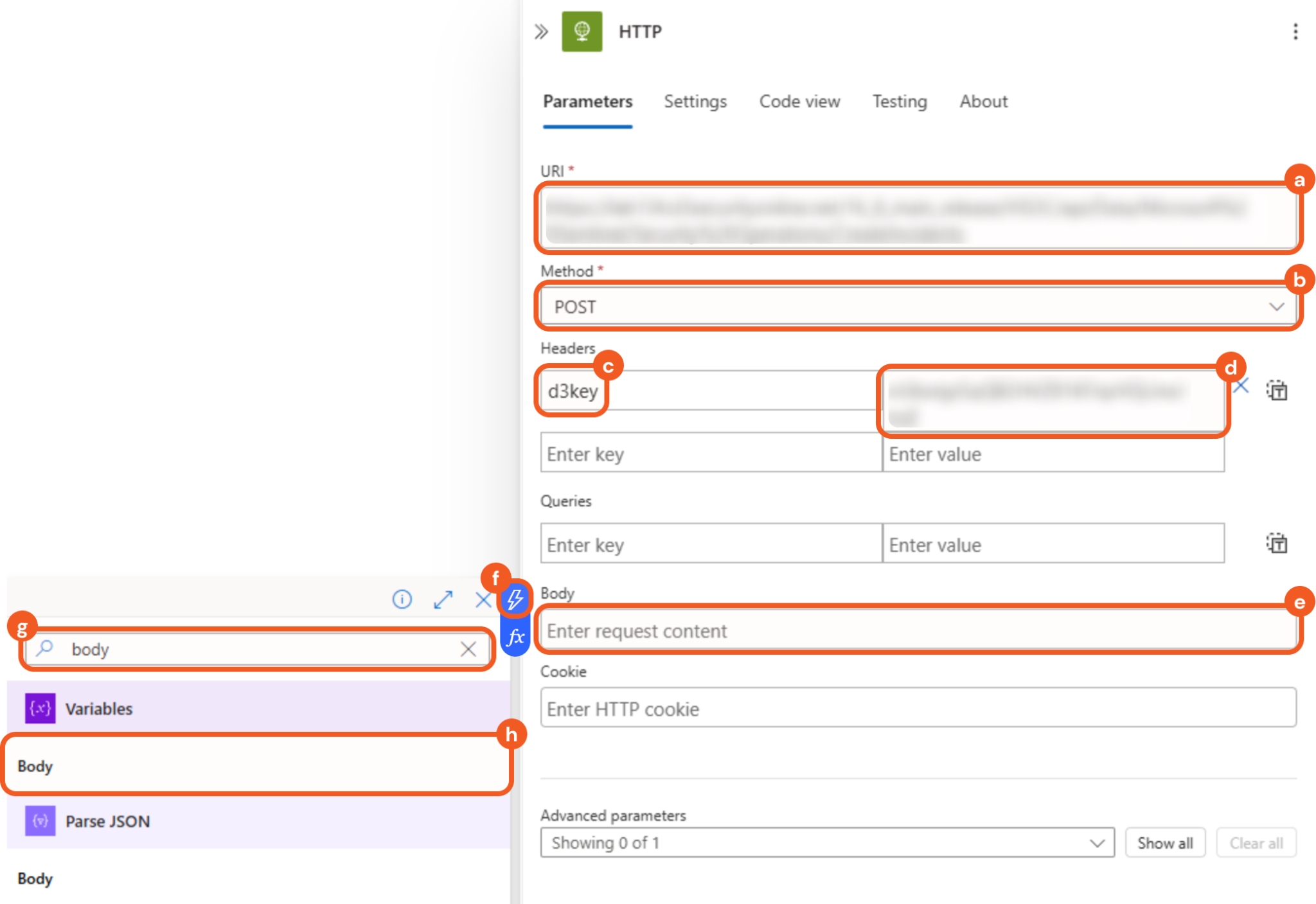 Add an HTTP action below the Parse JSON action.