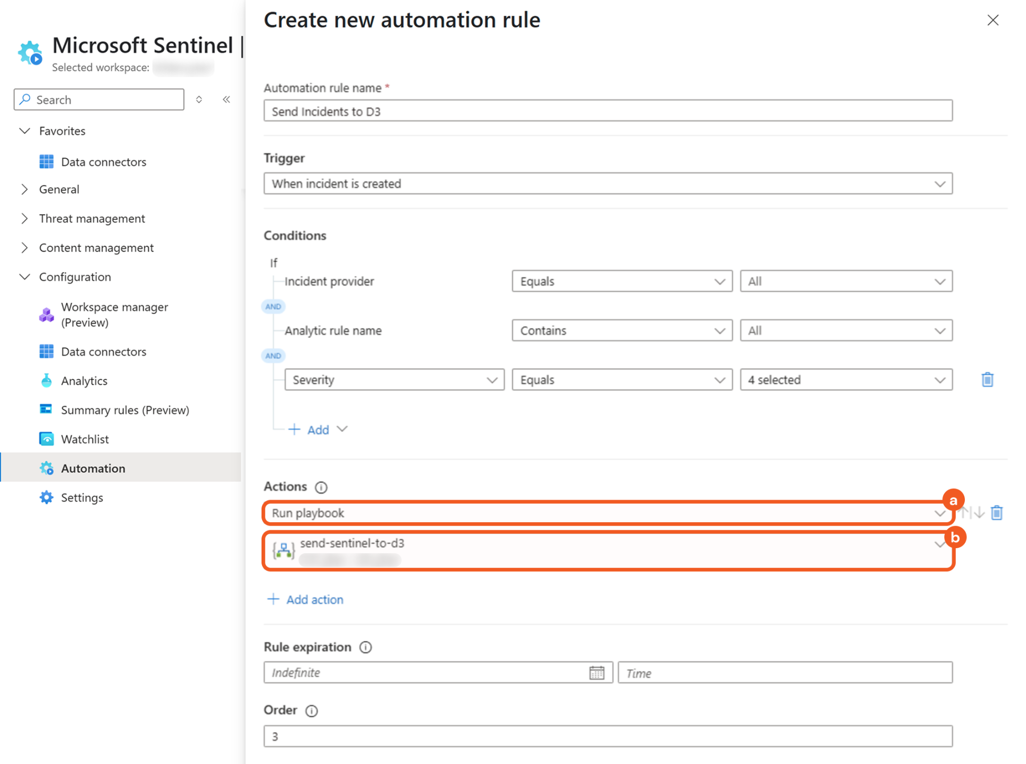 Select the Run playbook option in the Actions section, then select the Logic app previously created.