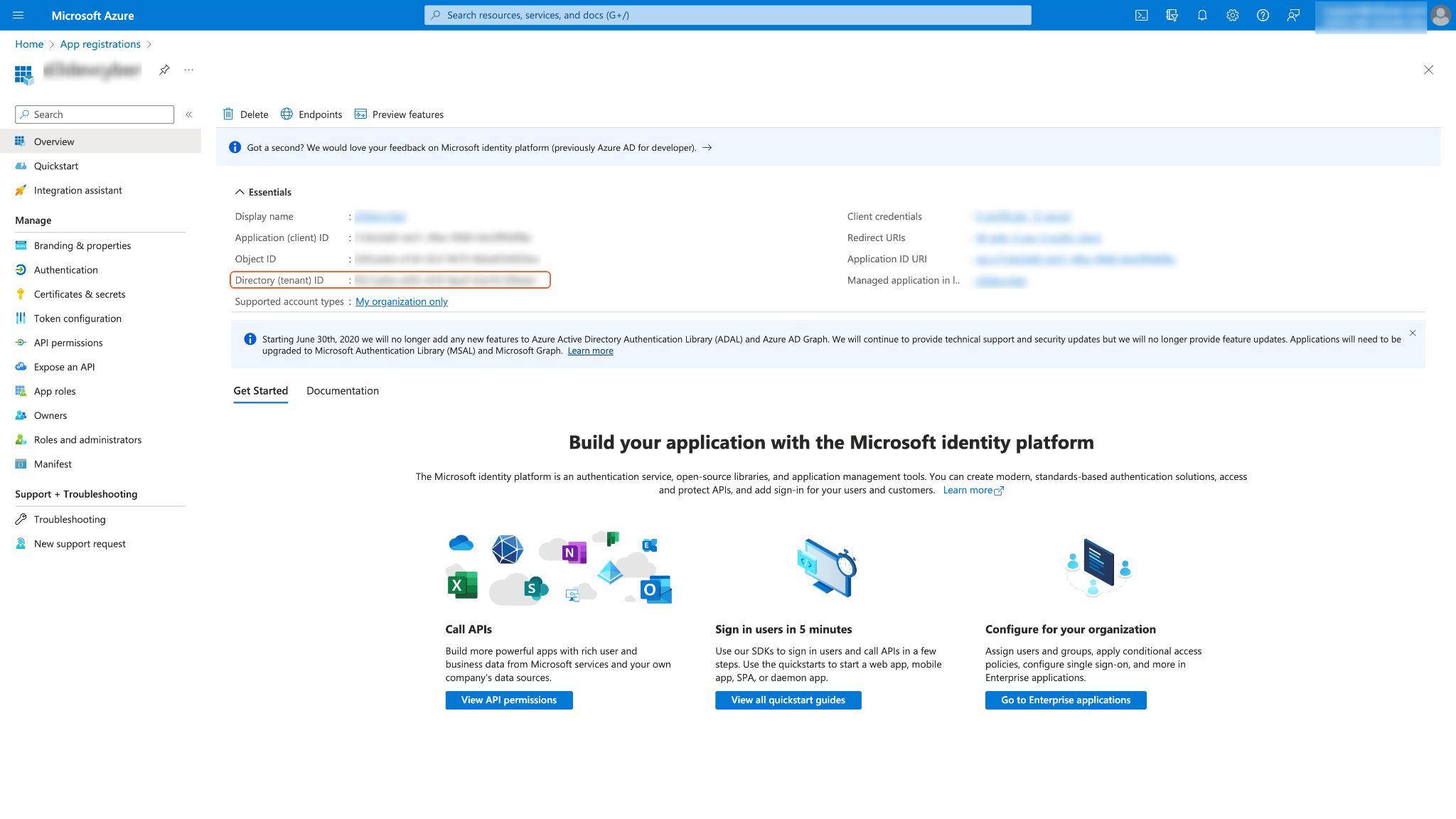 Obtain your app's Tenant ID. Go to https://portal.azure.com/#home and log in with your admin account. Navigate to App registrations, then locate and select your SharePoint tenant name. The Directory (tenant) ID will be displayed under the Essentials section. Store the ID in a secure location, it will be required to establish the connection in D3 SOAR.