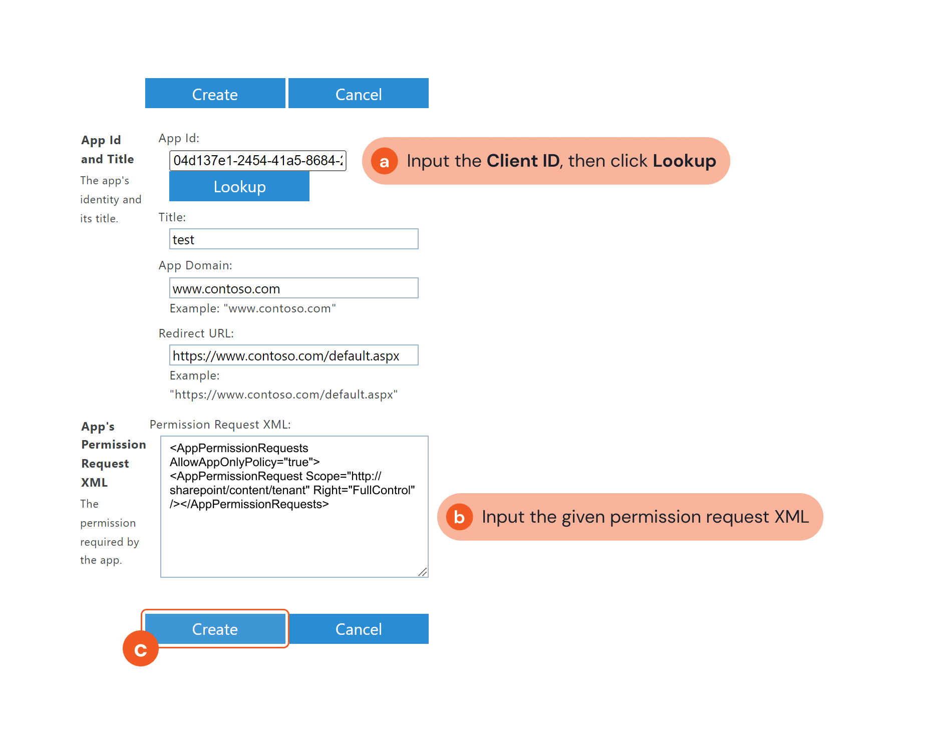 <AppPermissionRequests AllowAppOnlyPolicy="true"> <AppPermissionRequest Scope="http://sharepoint/content/tenant" Right="FullControl" /></AppPermissionRequests>Click Create.