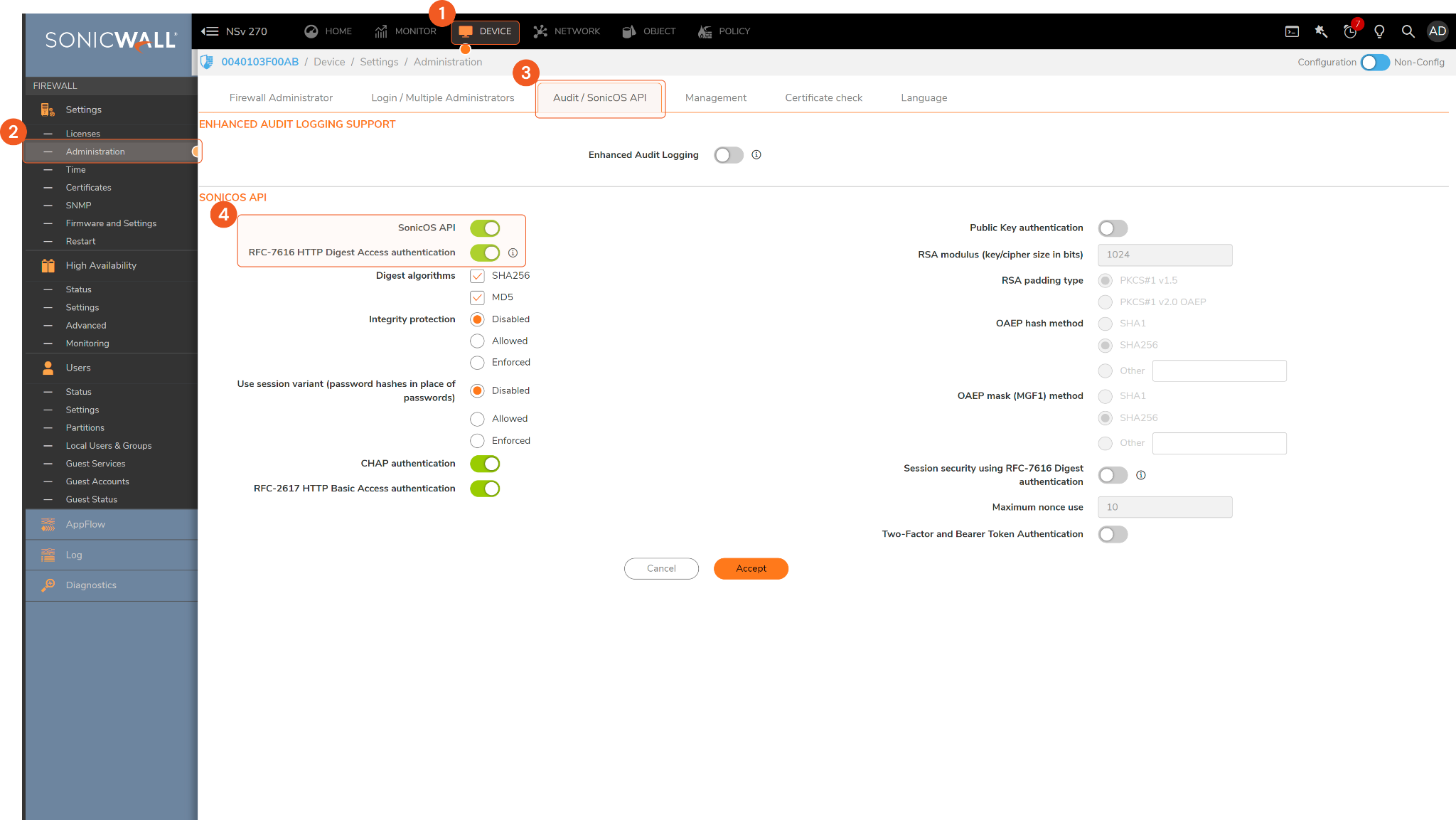 Select DEVICE from the top navigation bar. From the left sidebar, select Administration, then click on the Audit/SonicOS API tab. Ensure both SonicOS API and RFC-7616 HTTP Digest Access authentication are enabled.