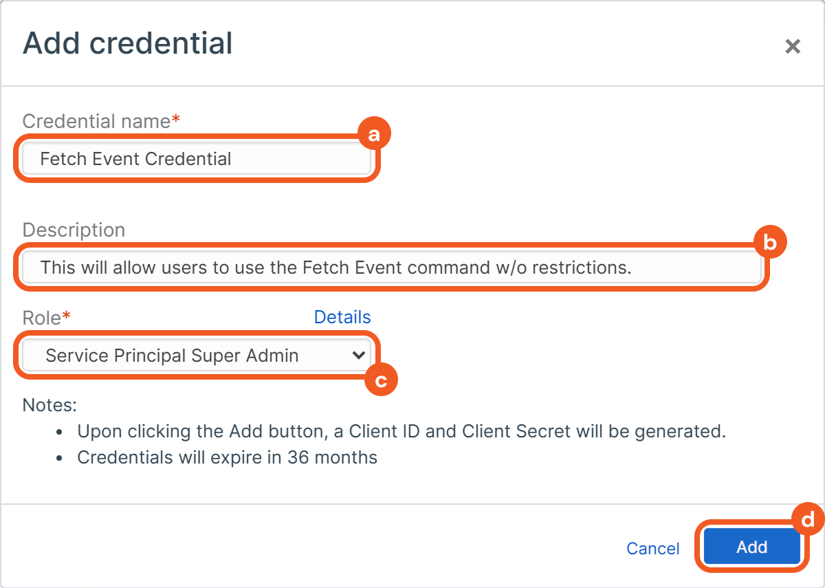 Select the role. For example, to fetch all event types using the Fetch Event command, select the Service Principal Super Admin role.