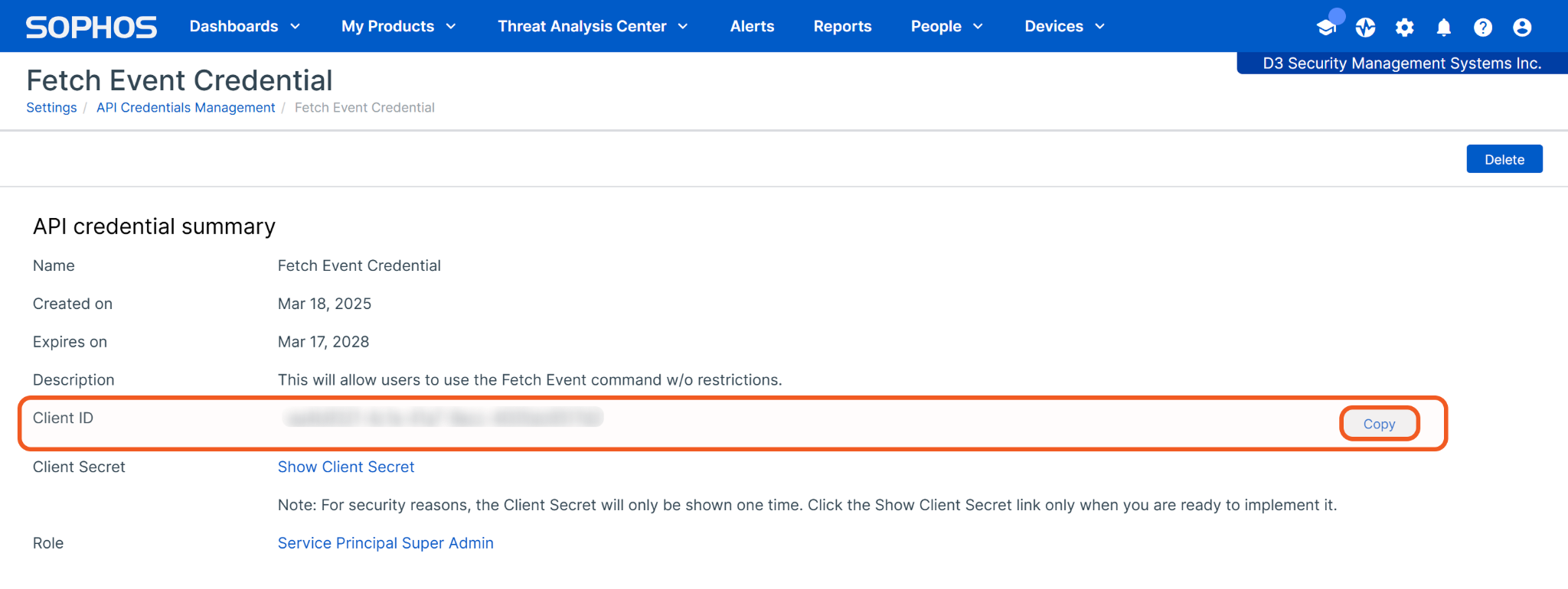 Click the Copy button and save the Client ID in a secure place. Refer to step 3i sub-step 2 in Configuring D3 SOAR to Work with Sophos Central V2.
