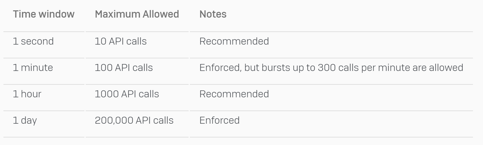 Sophos Central enforces API rate limits to prevent overuse. Exceeding the API rate limits will return a 429 error. To avoid this, users should refer to the following request limits: