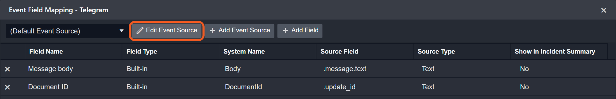 The Telegram system integration includes pre-configured field mappings for the default event source.