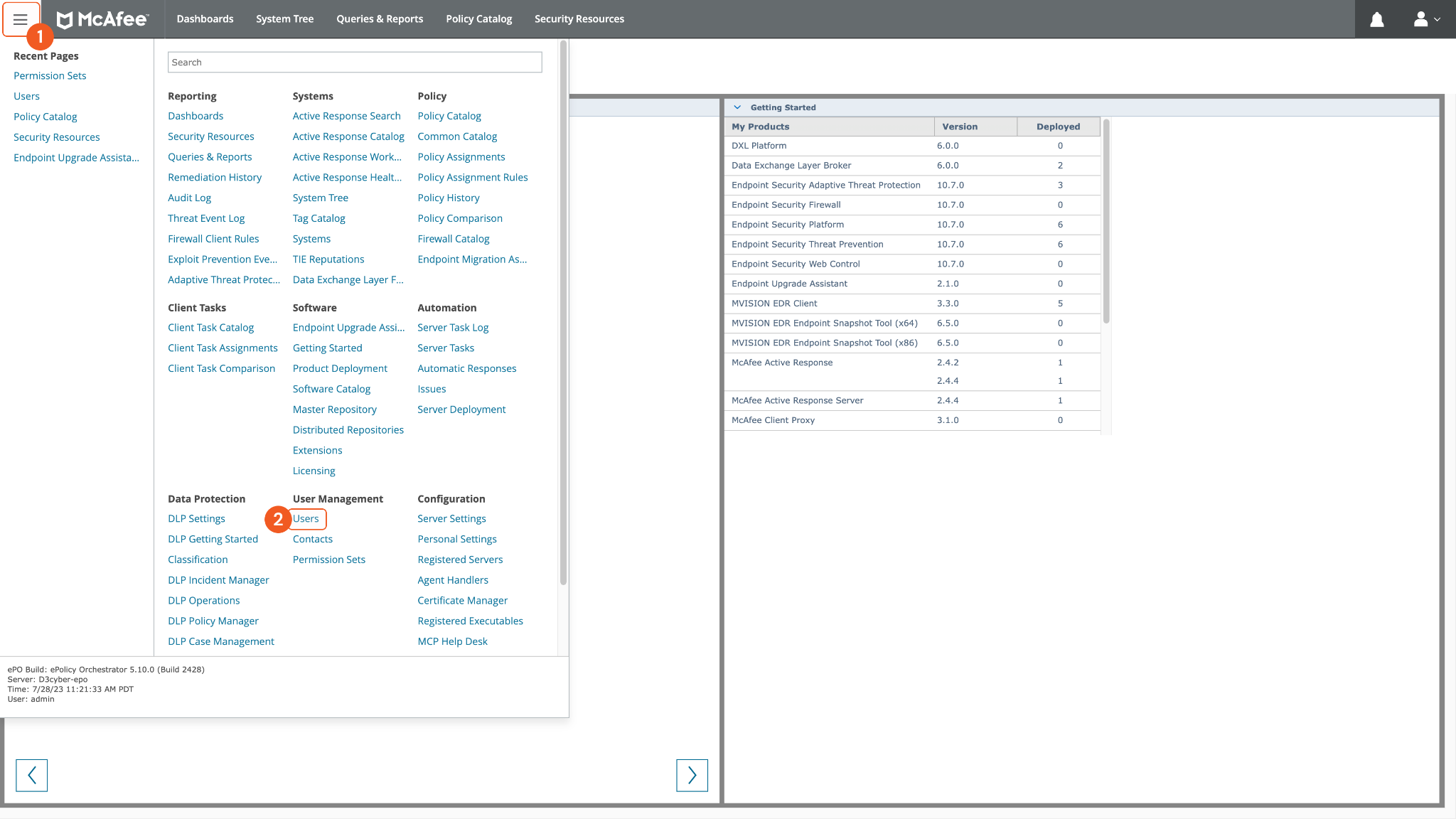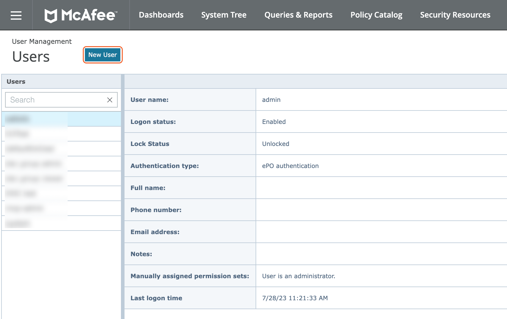 Once logged into your Trellix McAfee ePO environment, navigate to User Management > Users.