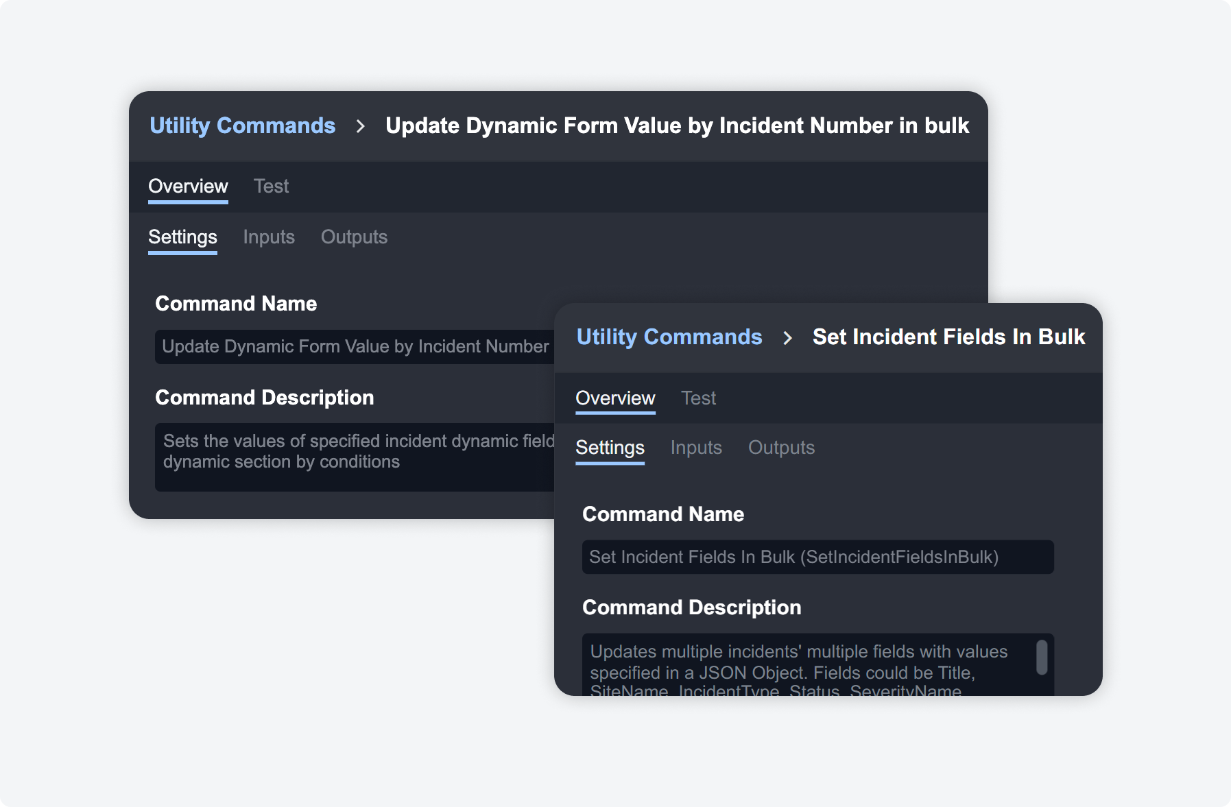 Two new utility commands have been added to allow bulk actions for setting incident fields and updating dynamic form values. These utility commands can be added to playbooks to streamline the incident management workflow for MSSPs and SOC teams processing large volumes of incidents.