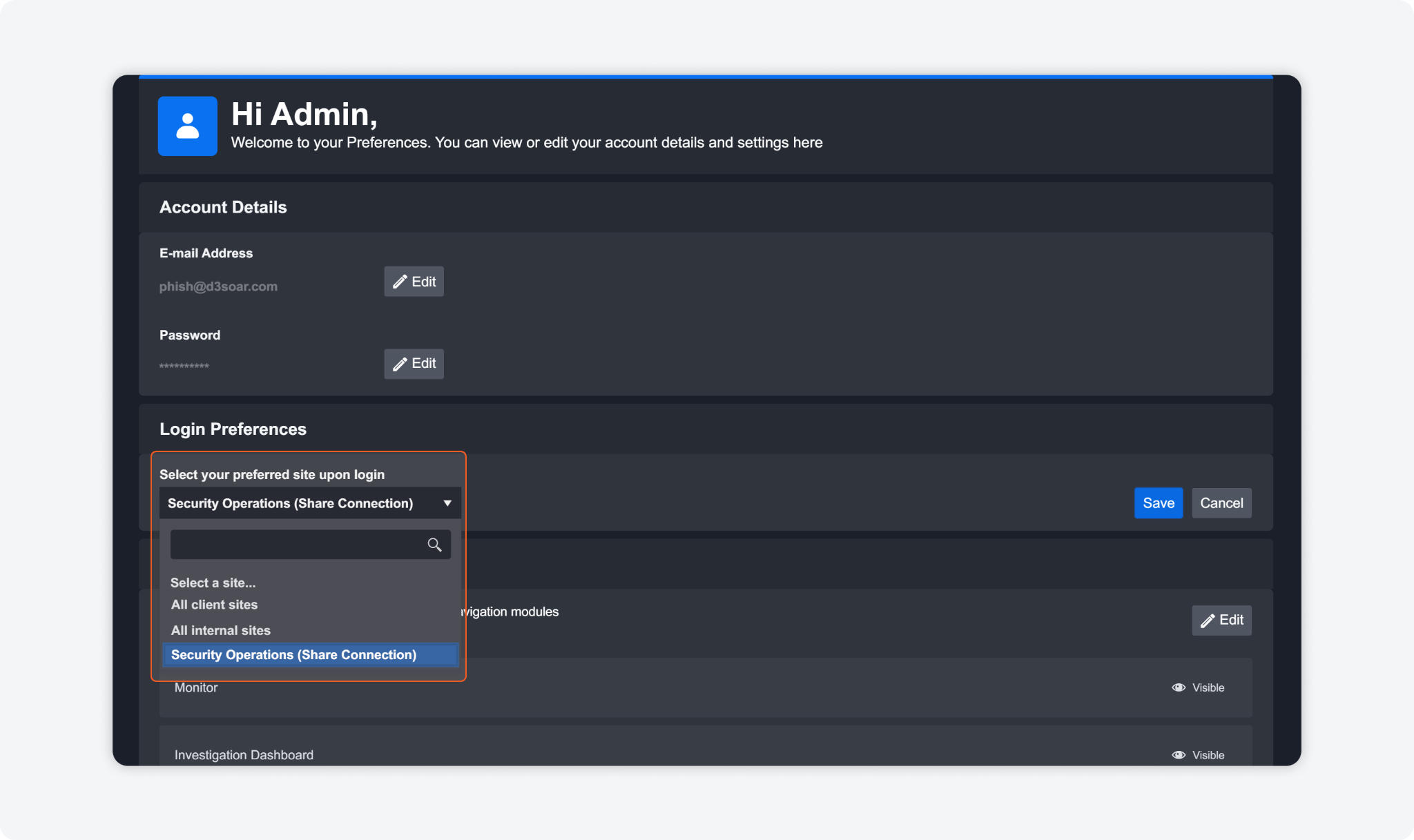In My Preferences, you can customize your preferred landing site upon logging into VSOC. With this setting configured to the user’s role and responsibilities, SOC analysts and MSSPs can spend less time navigating the platform and more time focusing on incident response and security operations.