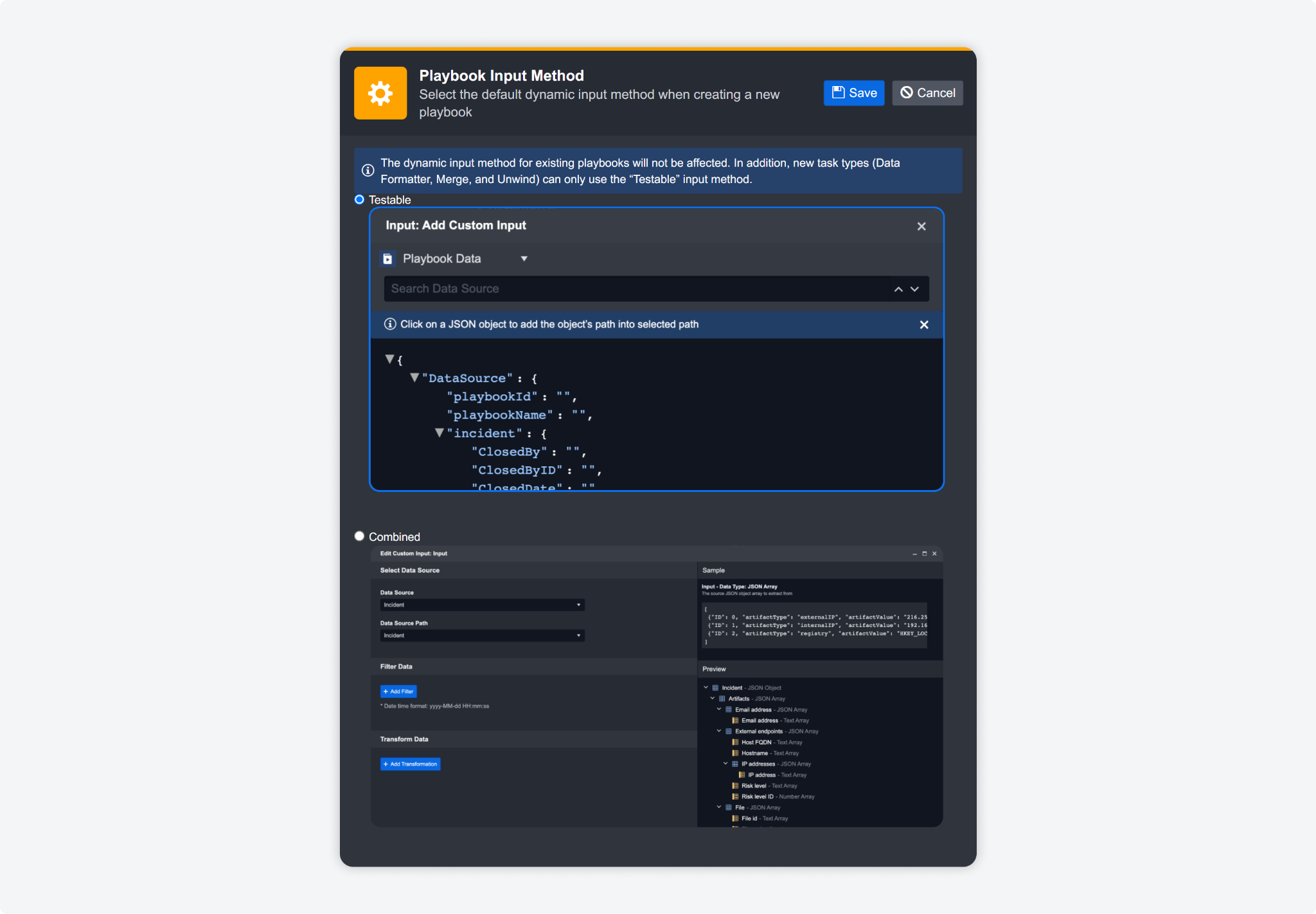 The dynamic input method for playbooks can now be selected at the application level, the playbook level and the playbook task level. This enhancement improves compatibility with playbooks created with previous versions of D3 SOAR and gives you more flexibility in how you use dynamic input methods to build playbooks.