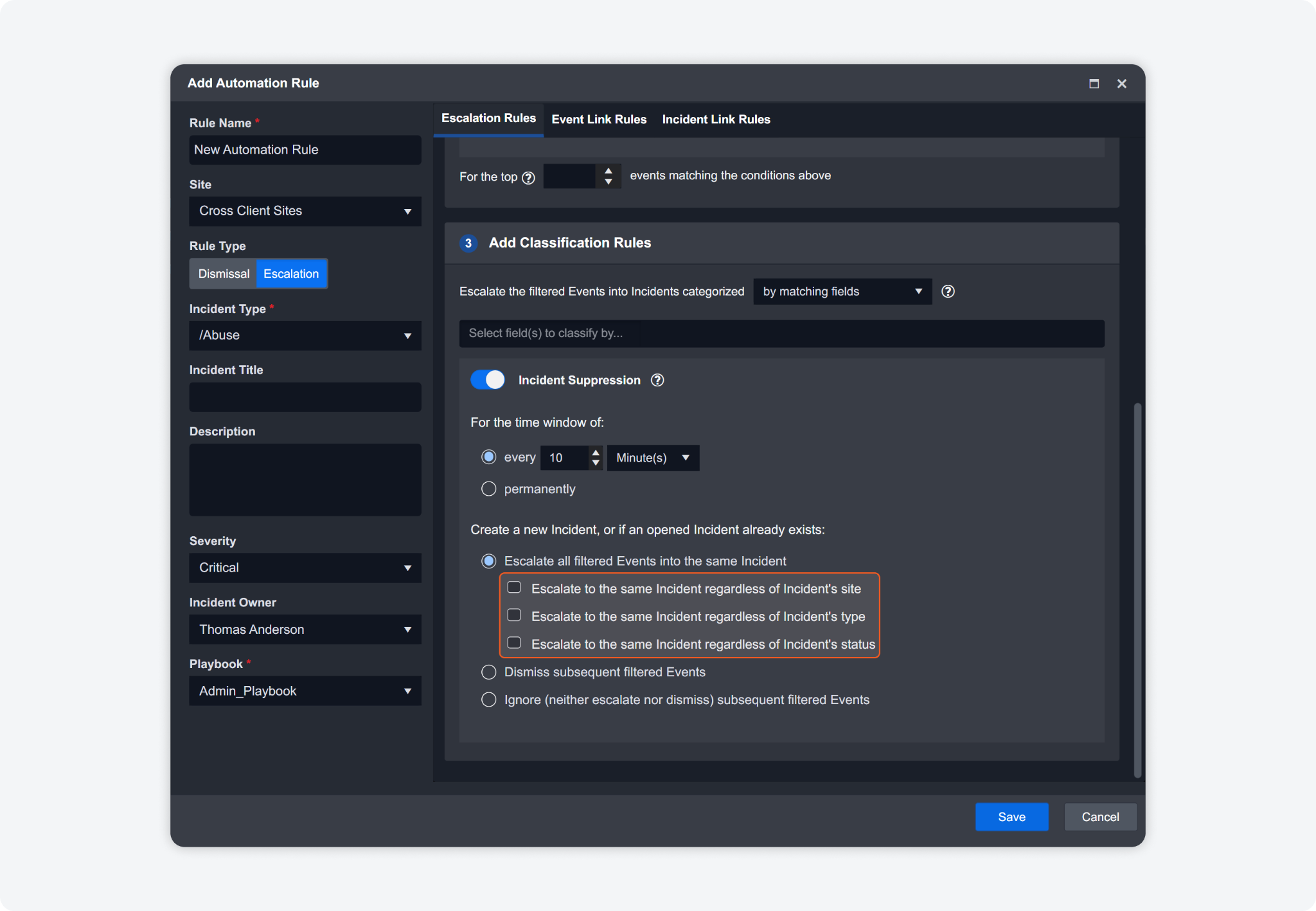 Event Automation Rules can now be shared with specific sites, making it easier to correlate new events with incidents that may be located on different sites when using incident suppression.