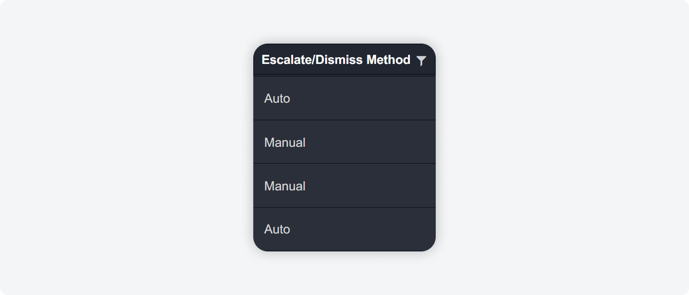 A new column indicating whether an event's escalation or dismissal was manual or automatic has been added to the events dashboard. This new feature allows MSSPs to easily track and use exported event dashboard data to generate reports on event handling, particularly for customers who want to see whether a particular event was processed automatically or manually.