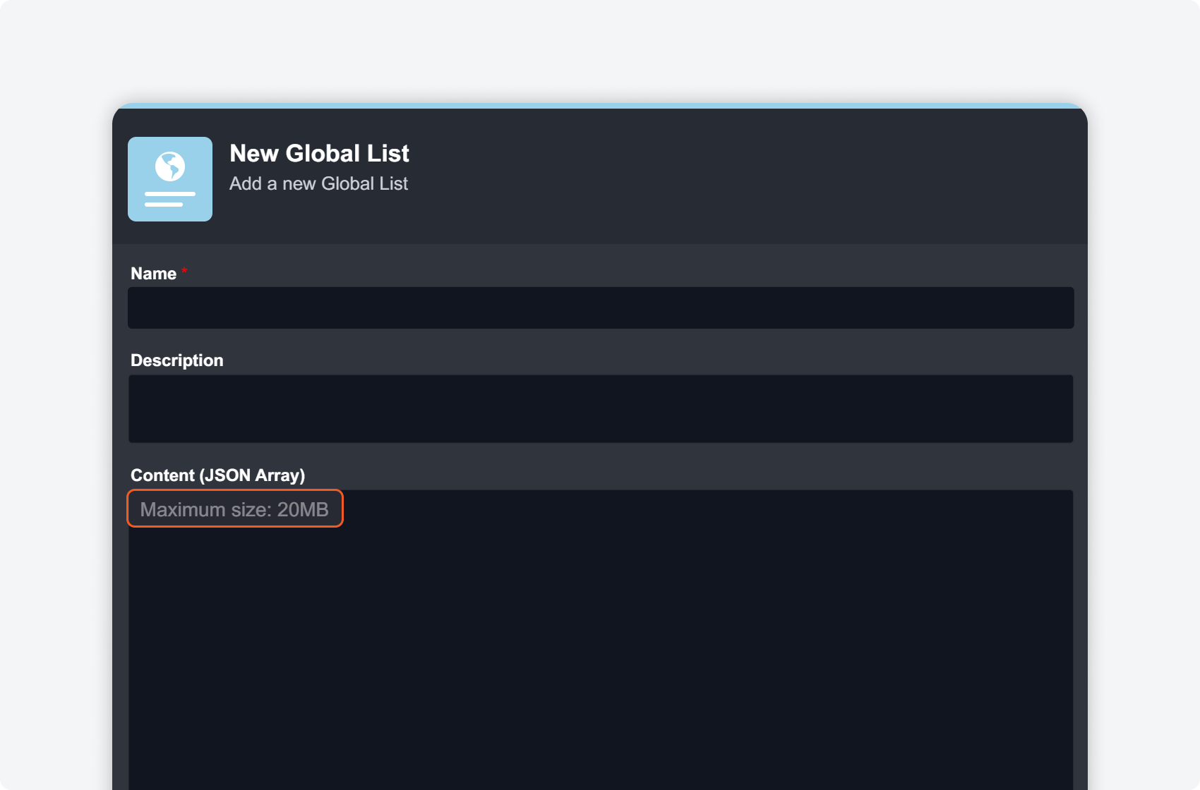 We have limited the maximum size of a global list to 20 MB. This will help improve the performance of the VSOC application and ensure seamless data processing between playbooks and global lists.