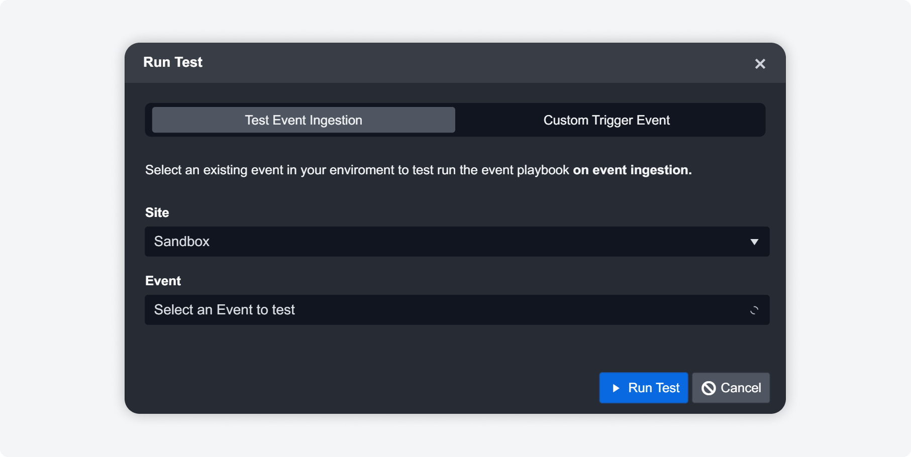 You can now select an existing event as test data to simulate the on event ingestion trigger. This eliminates the need to manually build test data. This feature streamlines and speeds up the testing process for event playbooks. The original process of building custom trigger data will still be available by selecting Custom Trigger Event.