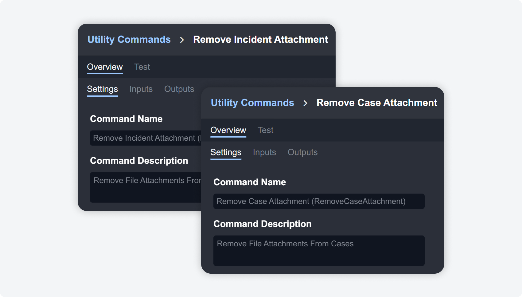 The Remove Case Attachment and Remove Incident Attachment utility commands can be used to remove attachments from specified arrays of case numbers and incident numbers, respectively. You can integrate this with playbook workflows to automate the case and incident management process. This is useful for housekeeping and removing a large number of sensitive attachments from the system, giving you greater control of your data.