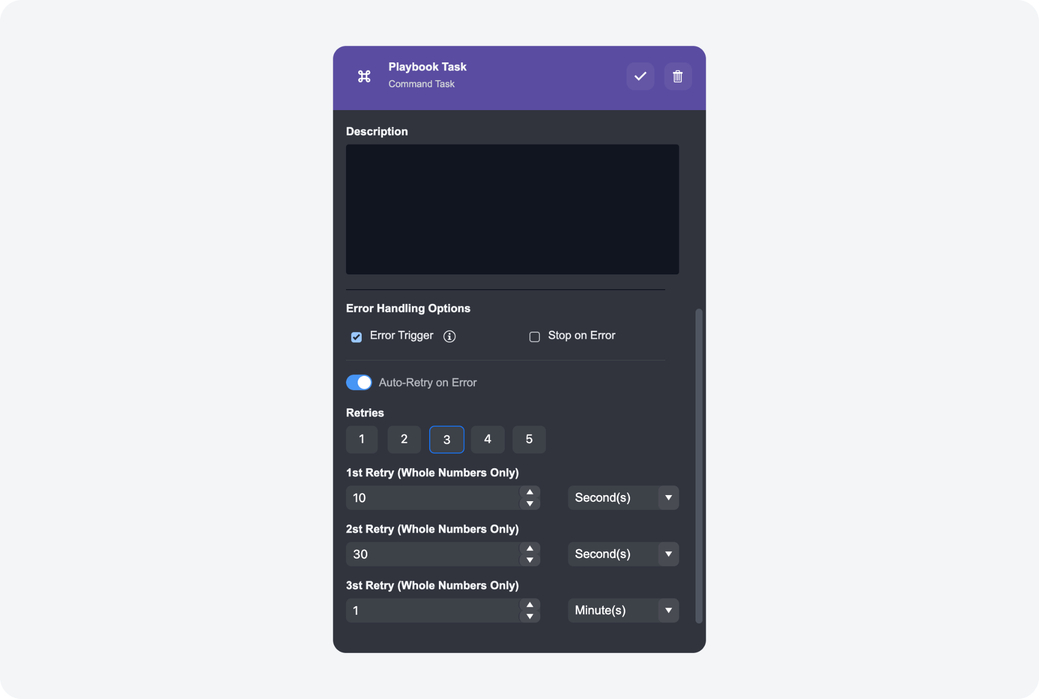 The new "Auto-Retry on Error" function within playbook tasks ensures continued playbook operations by automatically retrying failed tasks. This minimizes the need for manual re-runs and keeps your security workflows moving smoothly. After enabling auto-run, you have the following options to configure for the auto-retry on the error option: