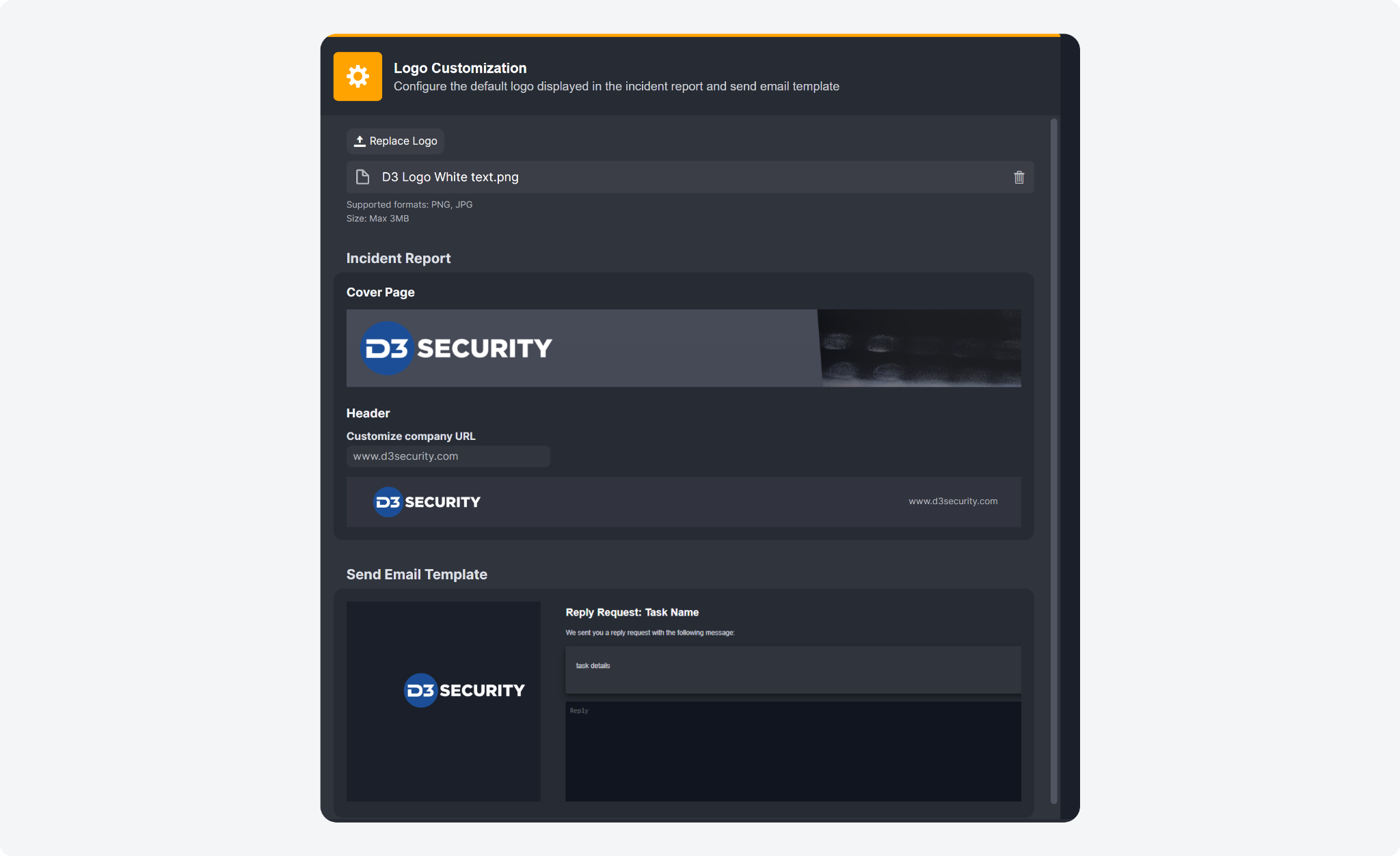 By default, the incident report and send email templates are equipped with D3's logo. You can now upload your own logo to replace the default one. Additionally, you can also include your company URL in the header of the incident report. Every time an incident report is generated or an email approval page is sent, your logo will be prominently displayed, providing your team and clients with a consistent and professional brand experience.