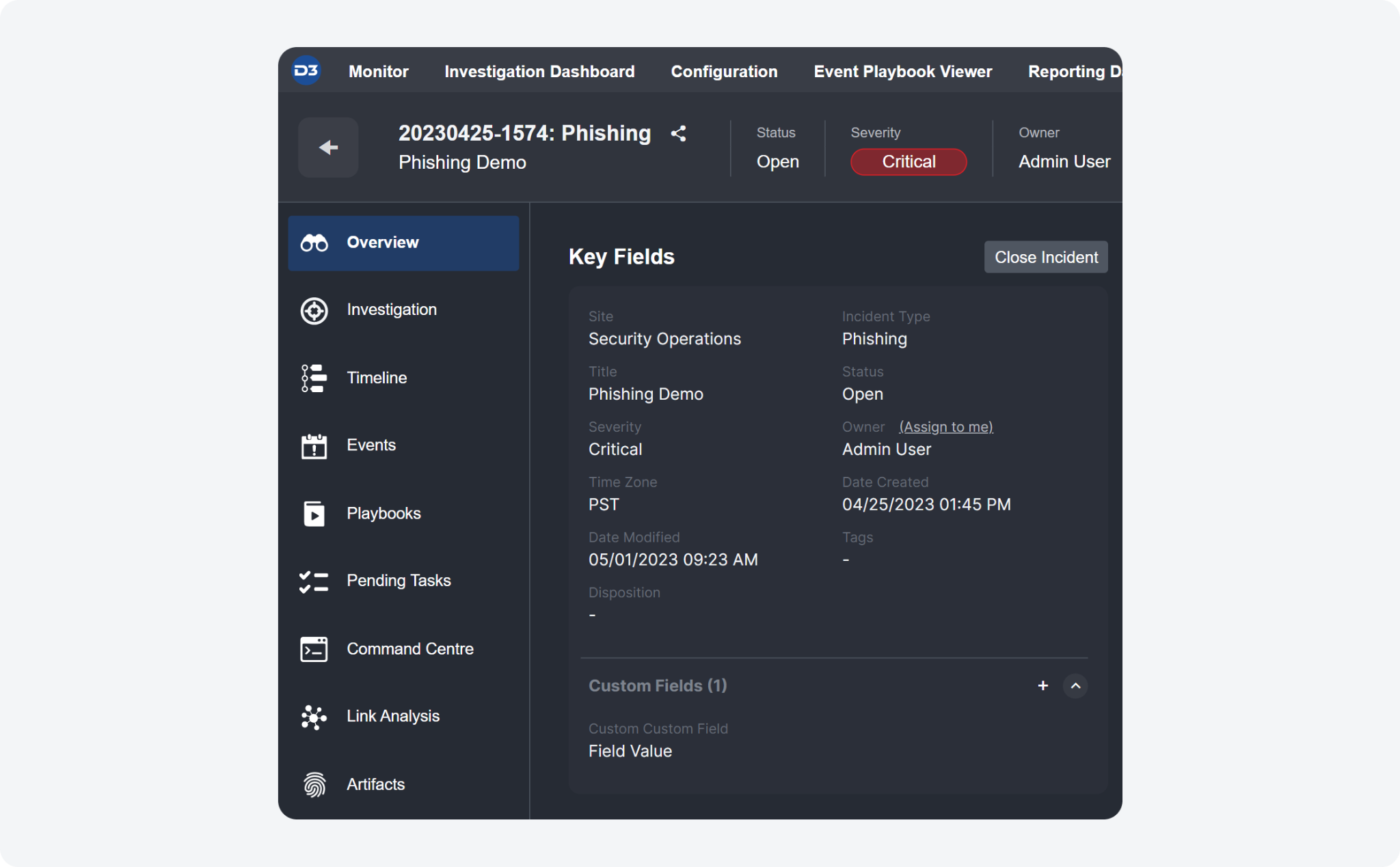 The Incident Summary section within the Overview Tab has been renamed to Key Fields, allowing for the inclusion of custom fields. Just like the previous Incident Summary section, Key Fields displays and allows you to edit the default incident fields filled in by an analyst or playbook during the event escalation or incident intake process. The notable enhancement is the introduction of the Custom Fields section, which provides flexibility in field mapping. Previously, these fields were limited to a predetermined set of system fields.