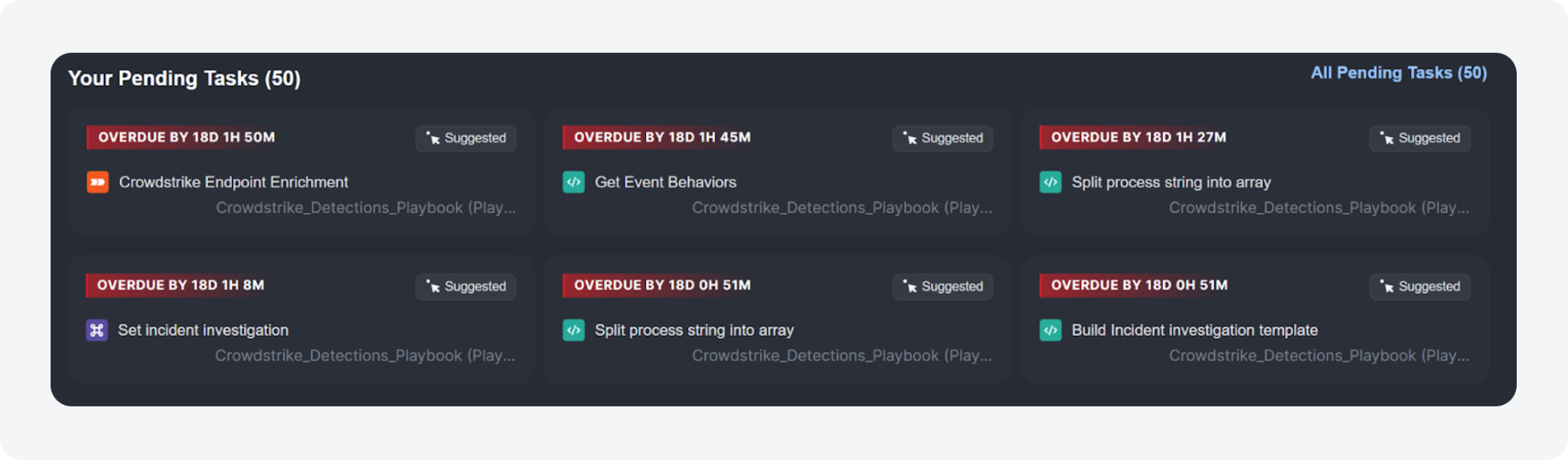 The Your Pending Tasks section provides an overview of your top six most urgent ad-hoc tasks and playbook tasks related to the selected incident. This section will only display tasks assigned to you.