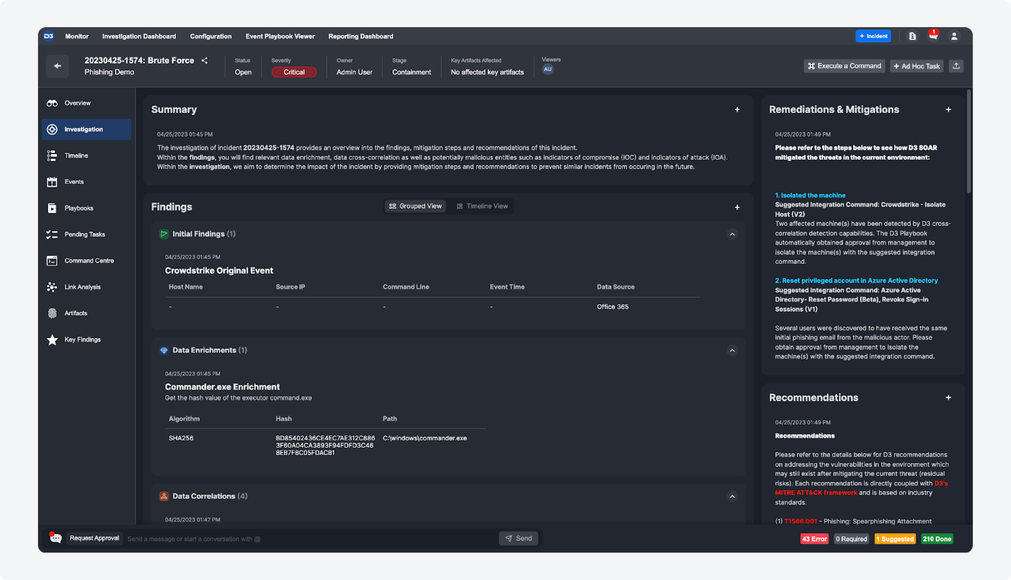 Investigations Tab: Clients can view insights on each incident curated by the MSSP, organized by Summary, Findings, Mitigations, and Recommendations.