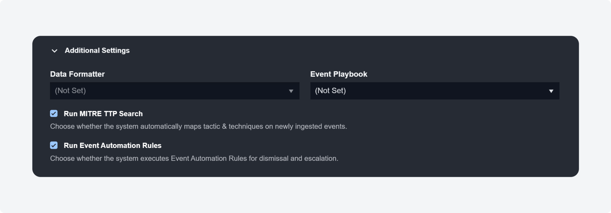 Upon configuring a new data source across different components in D3 SOAR, such as API Keys, JWT, Data Ingestion, Schedule, Upload File (from the Investigation Dashboard), and Ongoing Surveillance Task, two checkboxes will appear that allow you to customize the behaviour of ingested events. The first checkbox enables the automatic mapping of ingested events from the data source to MITRE tactics and techniques. The second checkbox enables event automation rules for event dismissal and escalation.