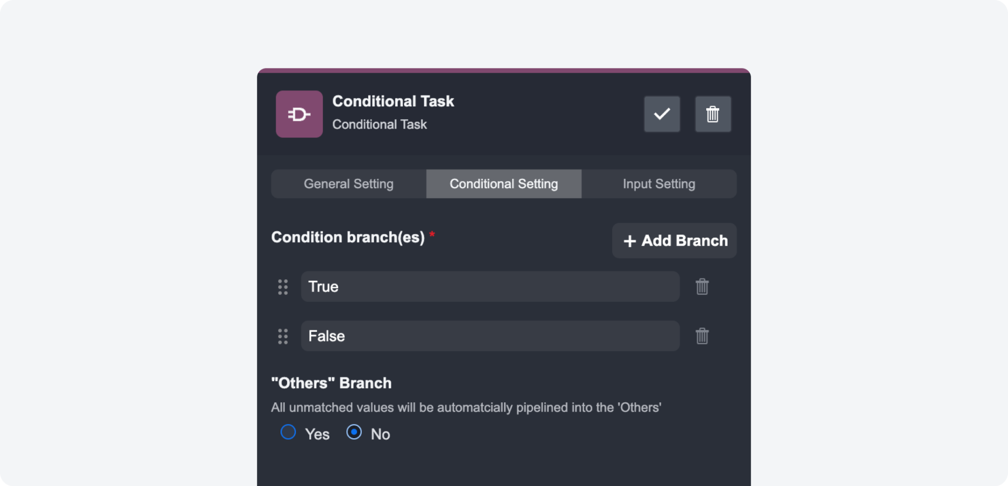 The conditional task settings have been restructured with a tabbed interface for an intuitive arrangement of configuration options. This update simplifies navigation and improves the user experience by logically grouping related settings.