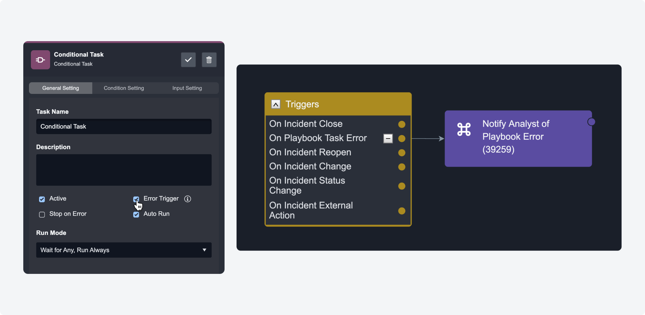 We've introduced the On Playbook Task Error trigger to enhance error management within incident playbooks. This feature, active by default for command, data formatter, conditional, and REST API tasks, triggers a follow-up workflow when an error occurs, such as sending an email alert to an analyst. It's designed for quick response and can be disabled as needed.