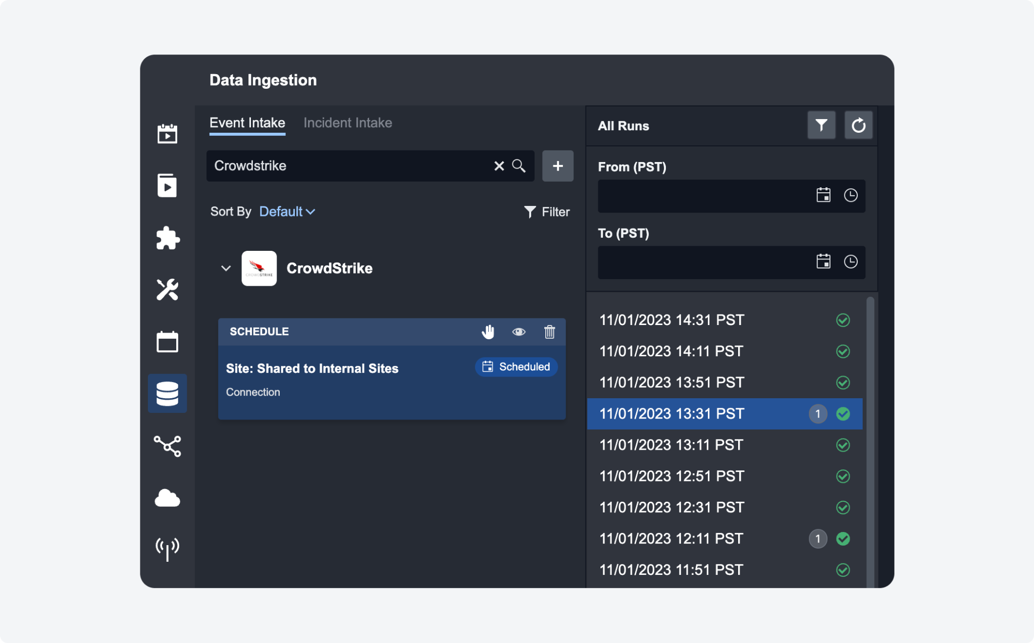 An event and incident creation count indicator has been added to event and incident intake logs. This feature systematically tallies the outcomes of each ingestion job. Accessing the event intake logs now provides a count of newly created events, while the incident intake logs display the total number of incidents generated.