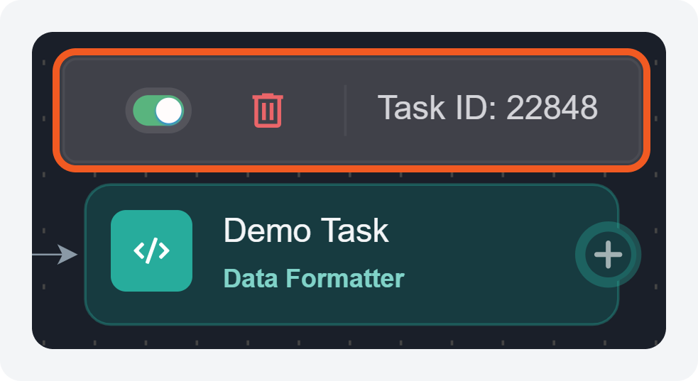 An action bar has been added to playbook task nodes, appearing on hover to provide quick access to key task management controls, and to display the task node ID for identification and reference. Users can activate or deactivate a task node using the toggle. Deactivating a node blocks its execution as well as that of all subsequent task nodes. The
