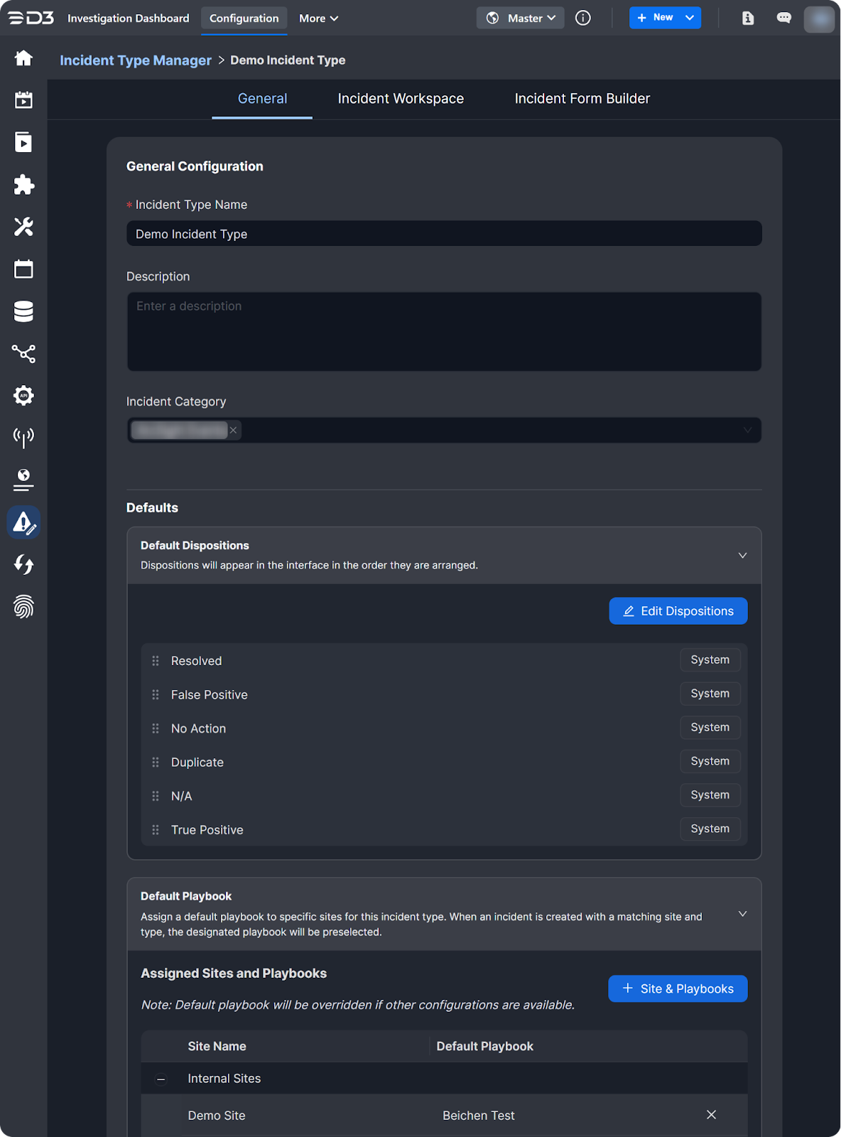 The new Incident Type Manager sub-module serves as the centralized interface for managing all incident types, with the Incident Form Editor now integrated within it. General configuration for each incident type is now available through a new interface under the General tab. Each incident type also includes an independently managed workspace library, enabling the creation of custom incident workspace dashboards composed of selected widgets.