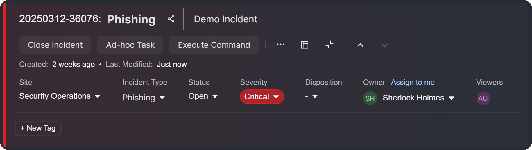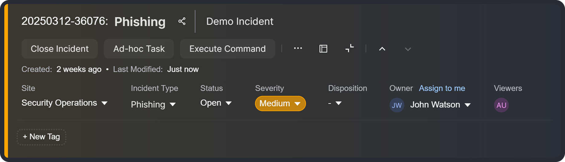 The incident header panel features a modern layout with improved visual hierarchy. Key details—incident type, severity, disposition, and ownership—are now more prominent. Offering immediate visual context and highlighting urgency, the background color of the header panel dynamically reflects incident severity levels: