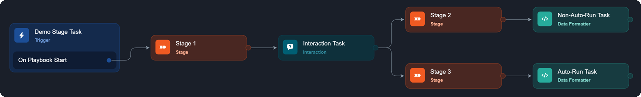 Playbook task nodes have been redesigned with a sleek, modern color pallet—such as deep navy for the root node, electric violet for command nodes, and rich terracotta for stage nodes.