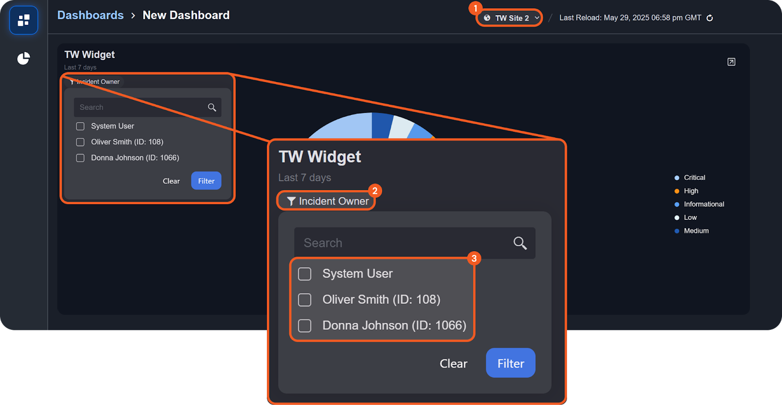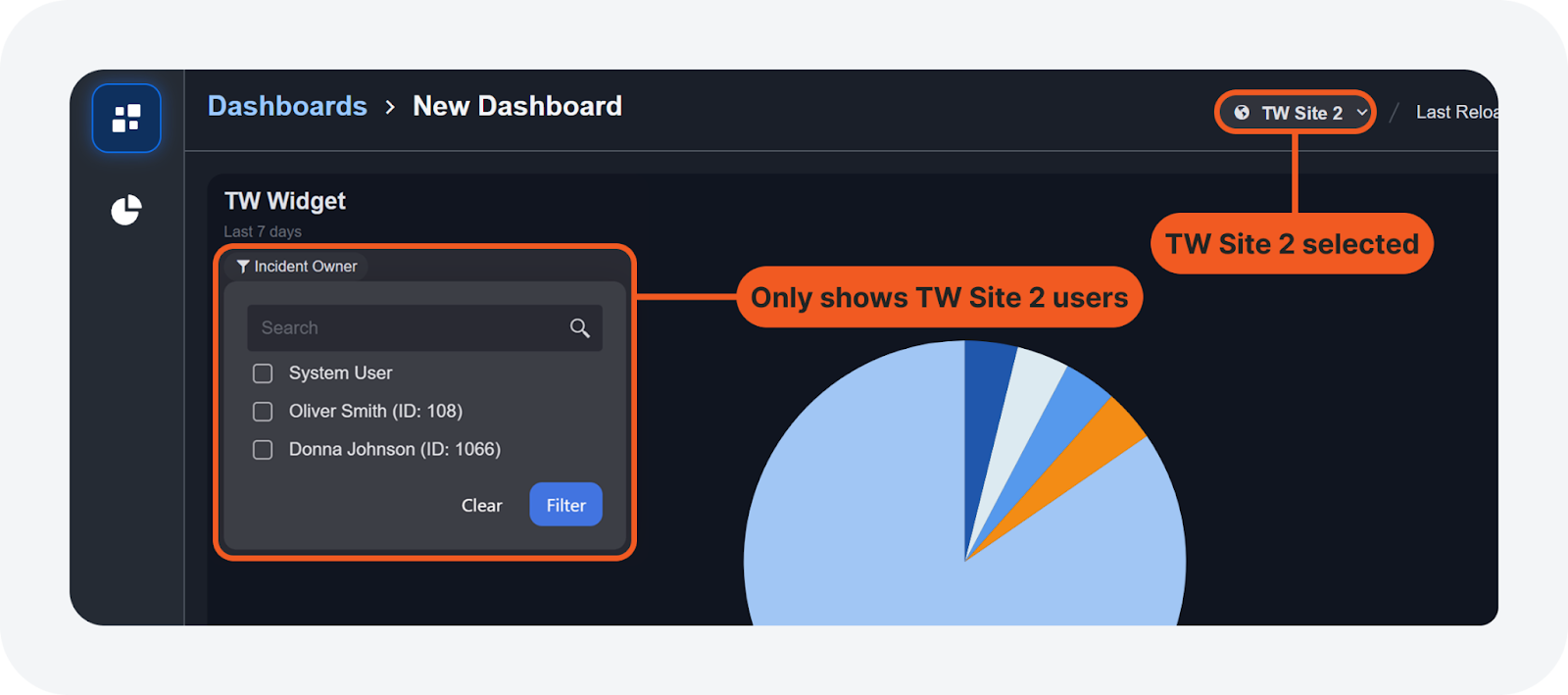 User-related dropdown filters in the Reporting Dashboard have been enhanced to show only users associated with the selected site. This improvement simplifies the filtering process and makes it easier to find relevant users.