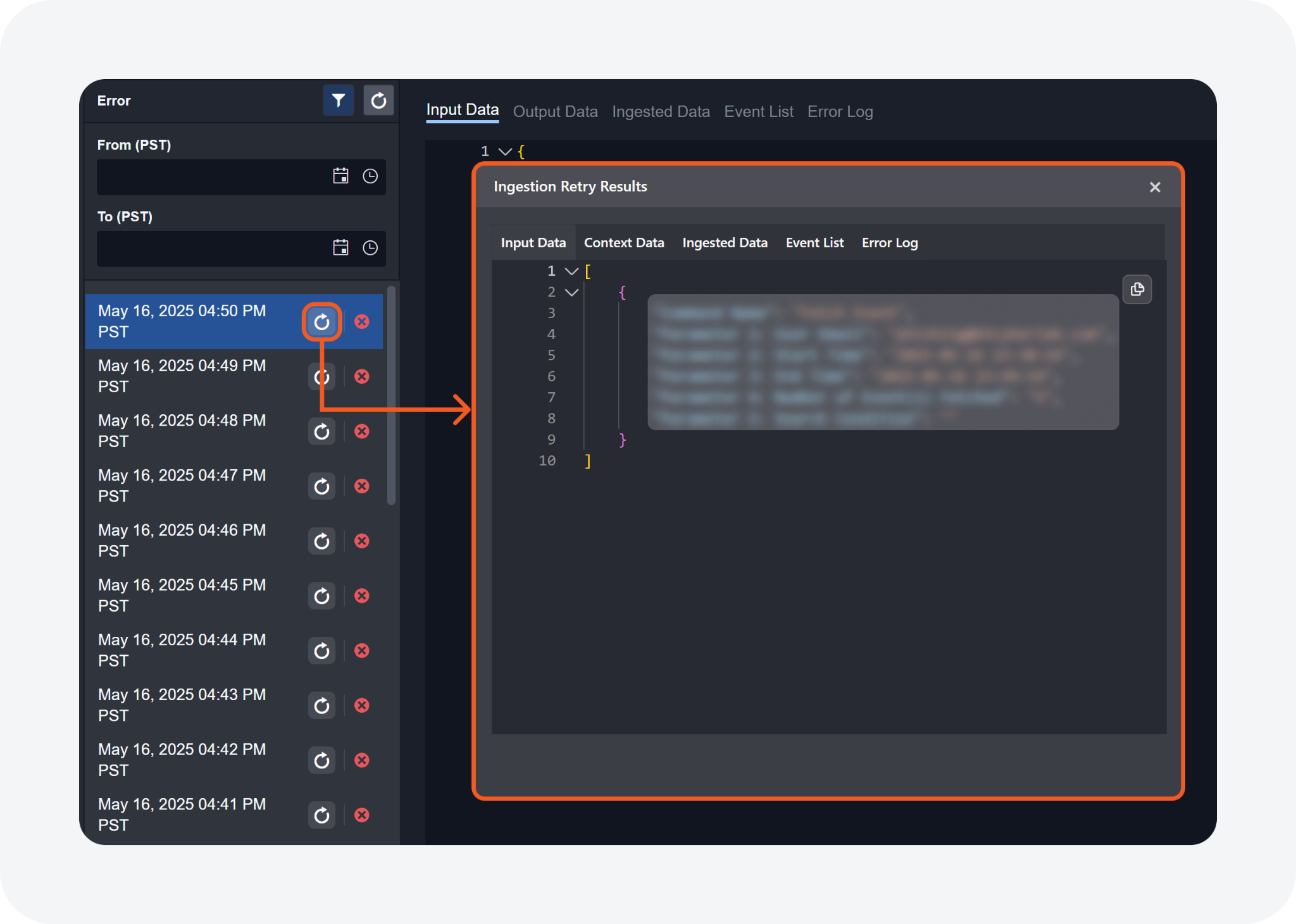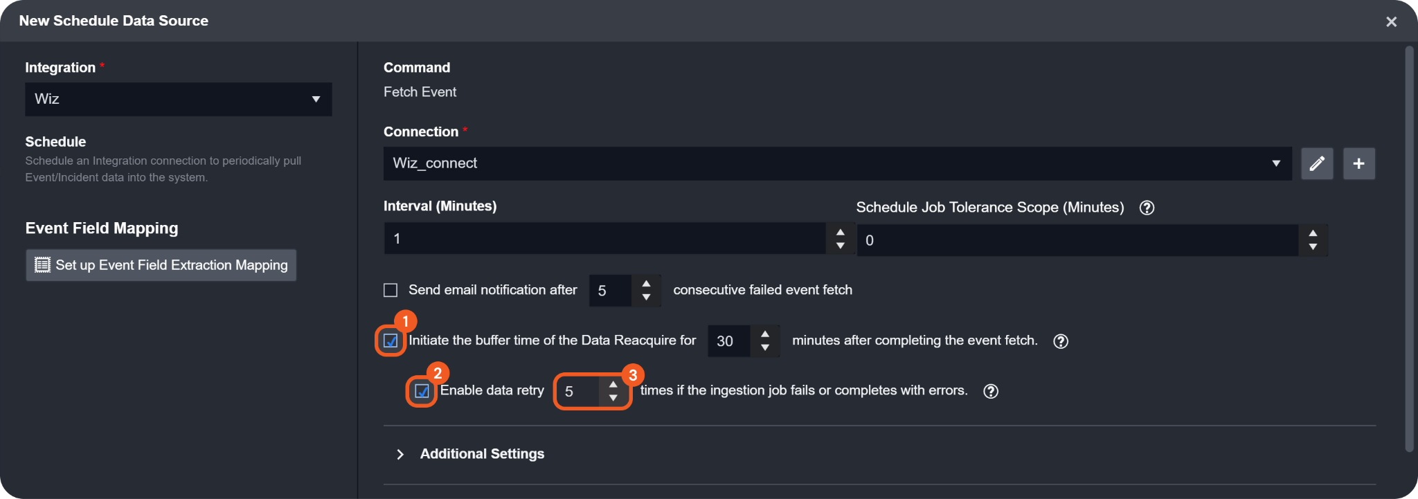 A new Retry mechanism enables automated retries during connectivity interruptions. It re-fetches event or incident data in chronological order, up to a user-defined limit, after the main ingestion job resumes normal operation.