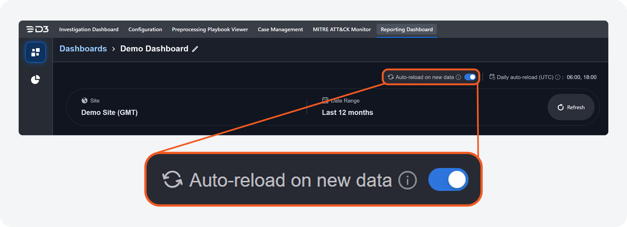 button on a persistent "Dashboard Update Available" banner, to view new data. The dashboard now supports live auto-refresh, automatically updating widget visualizations when new events or incidents are detected. This behavior can be enabled via the new Auto-reload on new data toggle.