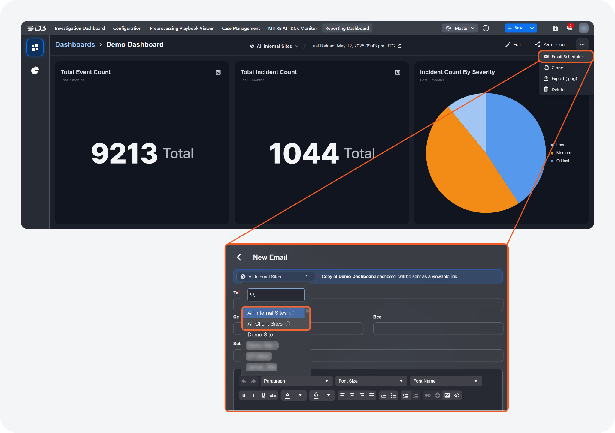 Previously, within the Reporting Dashboard module's Email Scheduler sub-feature, users had to create individual email schedules for each site, as there were no options to send a dashboard that included data from multiple sites. This enhancement introduces two new options, "All Internal Sites" and "All Client Sites," enabling users to distribute dashboards with data from all internal or client sites without needing to send them individually.