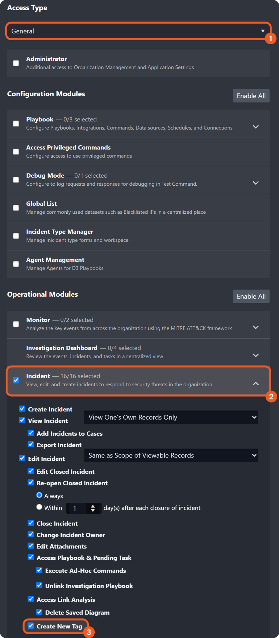 The ability to create new tags is now restricted to users with the Create New Tag permission. Users without this scope can still add tags to incidents from a predefined list.