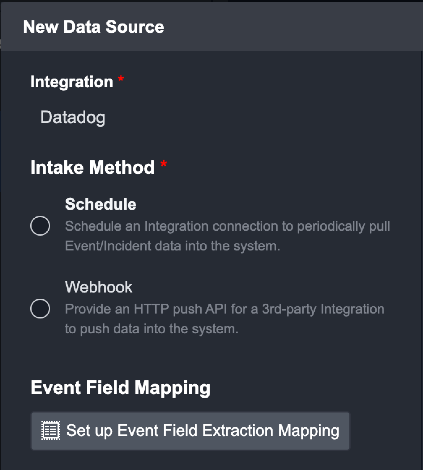 The availability of intake methods depends on the integration and user configuration. Some integrations have Webhook as well.