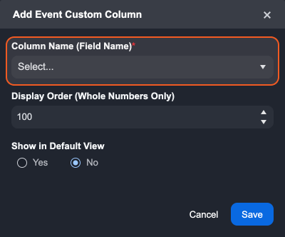 Select a field name to use as the column name. The field name can be configured in Event Field Mapping.