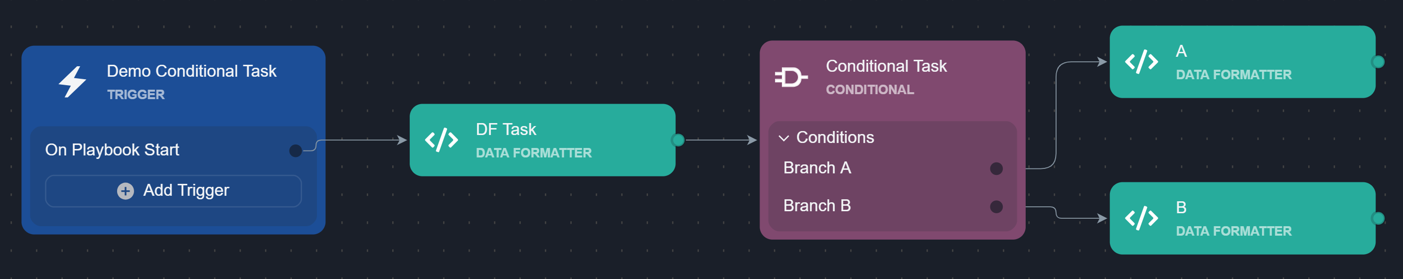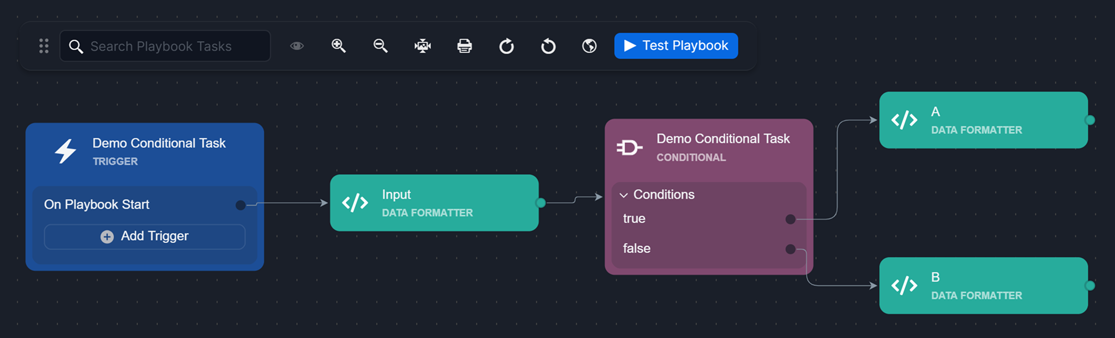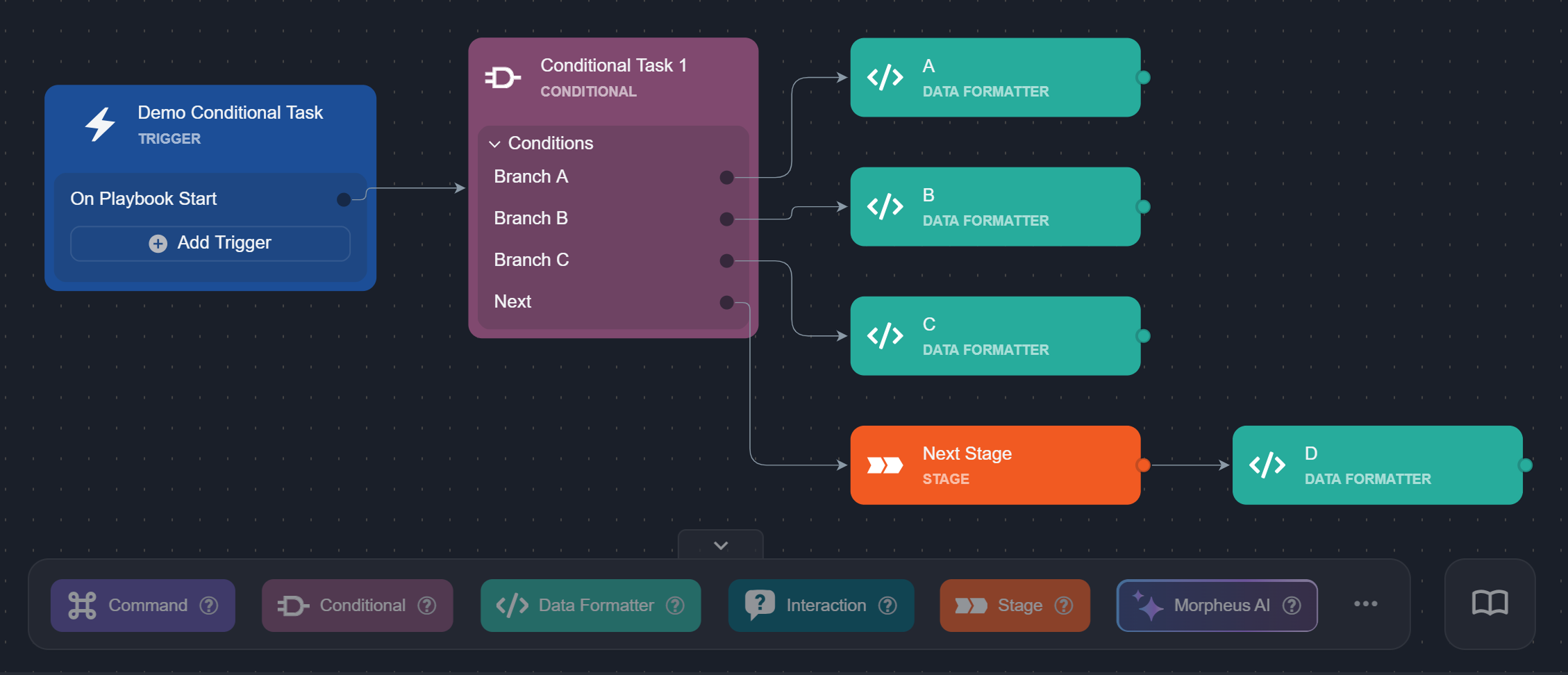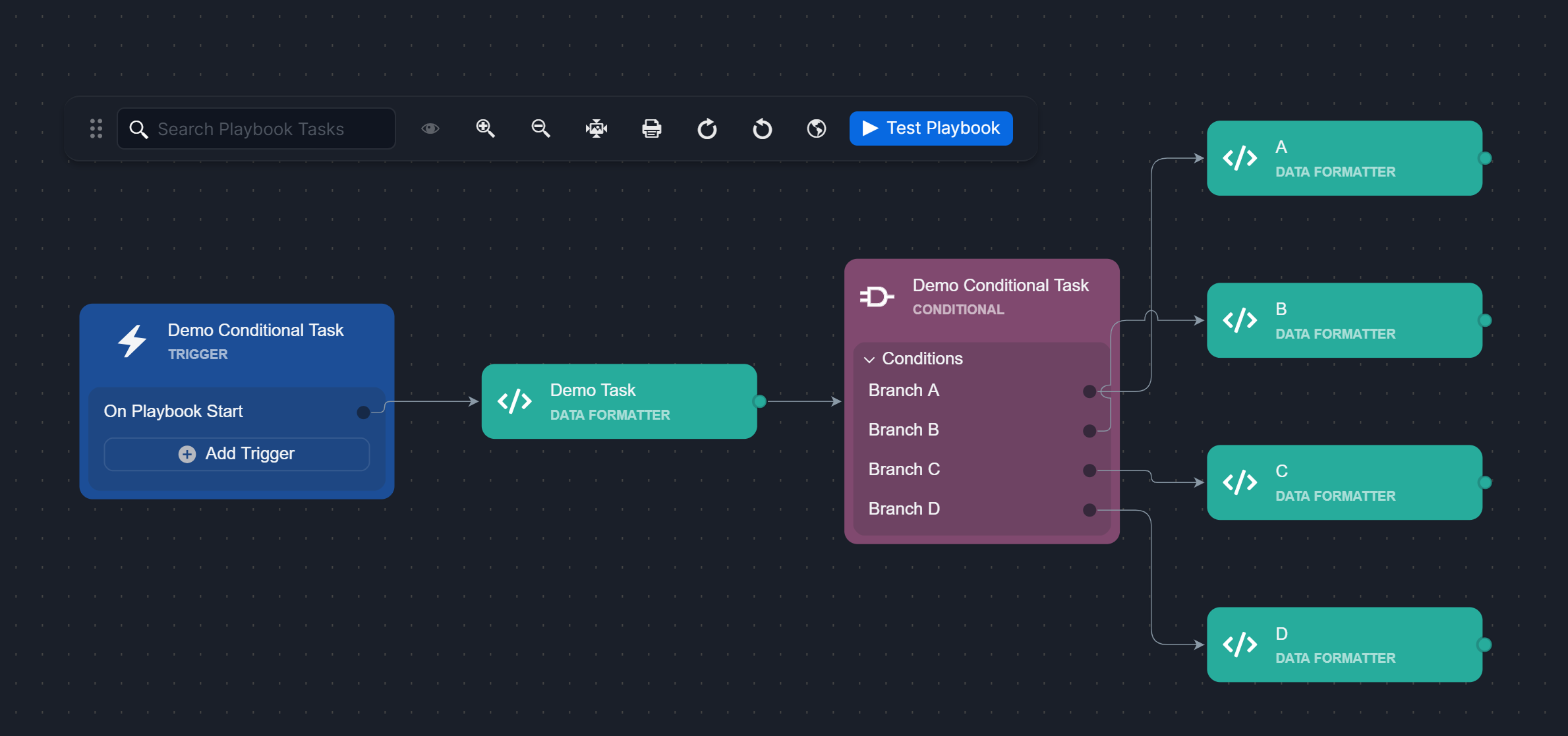 After defining branches, the next step is to connect playbook task nodes to each branch. Tasks connected to each branch define the next actions, ranging from simple operations to complex workflows.