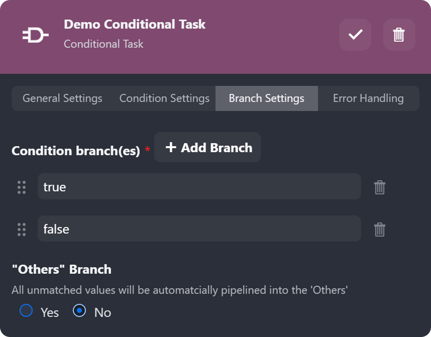 Configure the Demo Conditional Task to have a true and a false branch.