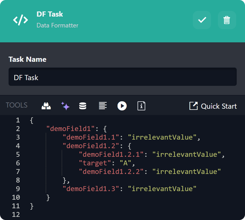 JSON{ "demoField1": { "demoField1.1": "irrelevantValue", "demoField1.2": { "demoField1.2.1": "irrelevantValue", "target": "A", "demoField1.2.2": "irrelevantValue" }, "demoField1.3": "irrelevantValue" } }