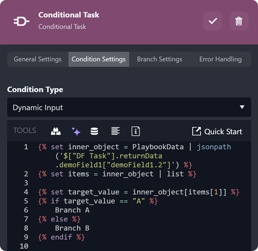 JSON{% set inner_object = PlaybookData | jsonpath('$["DF Task"].returnData.demoField1["demoField1.2"]') %} {% set items = inner_object | list %} {% set target_value = inner_object[items[1]] %} {% if target_value == "A" %} Branch A {% else %} Branch B {% endif %}LOGIC BREAKDOWN