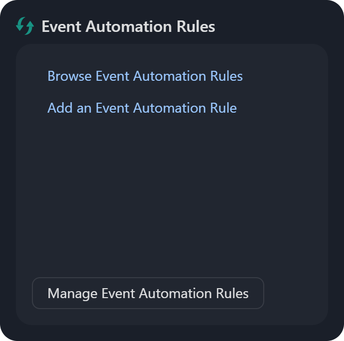 Event Automation Rules: The Browse Event Automation Rules link directs users to the Event Automation Rules module, while the Add an Event Automation Rule link also redirects users to the same module, opening the Add Automation Rule popup form for configuring dismissal or escalation rules.