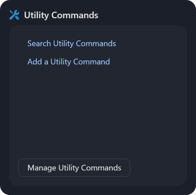 Utility Commands: The Search Utility Commands link directs users to the Utility Commands module, while the Add a Utility Command link also redirects users to the same module, opening the Add Command popup form for creating a Python or Codeless Playbook.