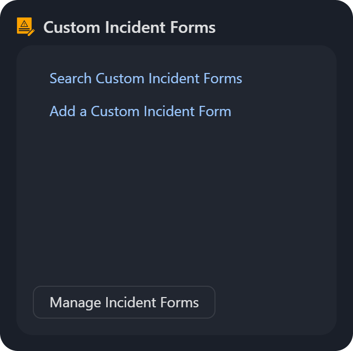 Custom Incident Forms: The Search Custom Incident Forms and Add a Custom Incident Form links direct users to the Incident Form Editor module, with the latter opening the New Incident Form popup for users to enter the name and description of the custom incident type.
