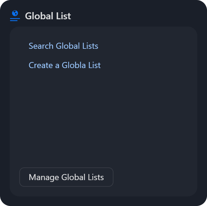 Global List: Options include searching or creating global lists, which redirect to the Global List module.